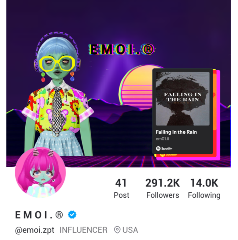 EMOI is a Zepeto Live Creator, digital asset creator, and a new artist on Spotify. She loves fashion and music, and she's very loved in the weirdcore community.